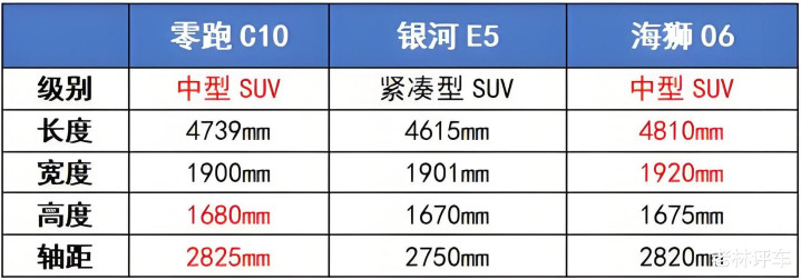 尺寸方面,由于零跑C10和海狮06定位中型SUV,银河E5定位紧凑型SUV,前两者的尺寸就更有优势,海狮06在长度和宽度方面比较有优势,零跑C10在高度和轴距方面比较有优势。当然,银河E5的尺寸在同级车型中也很大,只不过和它价格相近的另两款车级别更高,所以它的尺寸就不占优势了。提供更高级别的车型,价格却相似,可能这就是“错位竞争”吧?