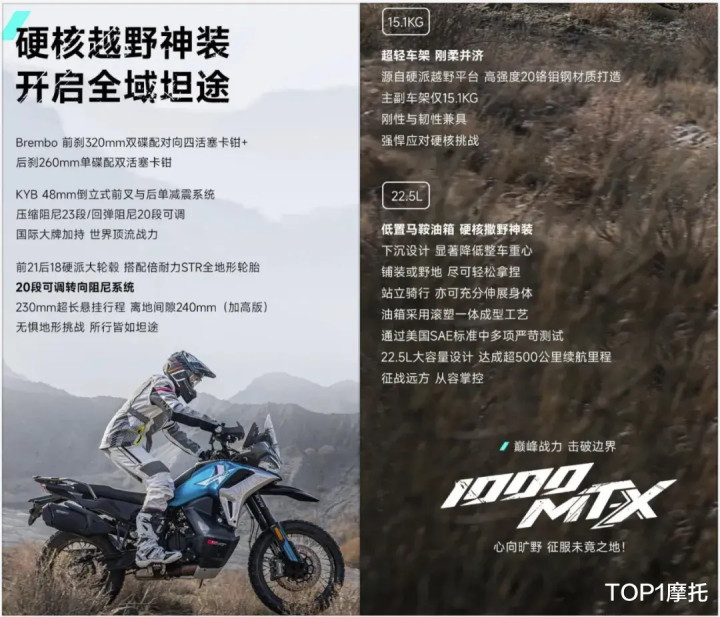 春风1000MT-X之所以能把整备重量做到219kg,20铬钼钢材质的车架做了不小的贡献,主副车架加起来仅15.1kg重确实相当优秀。油箱的设计与800MT-X相同,这也是KTM大排量ADV上惯用的低置马鞍油箱设计,容量达到了22.5升,官方参考续航里程超500公里。